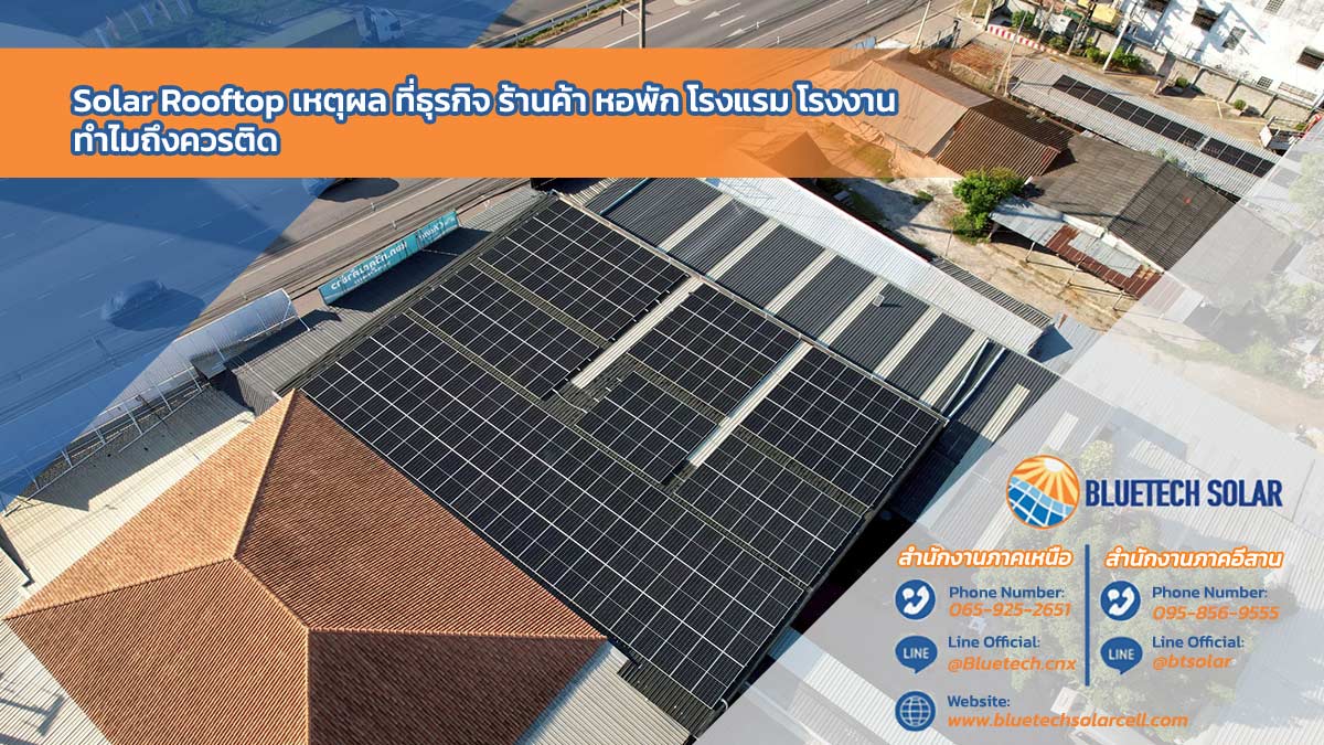 Solar Rooftop เหตุผล ที่ธุรกิจ ร้านค้า หอพัก โรงแรม และโรงงาน ควรติดตั้งในยุคค่าไฟแพง ติด Solar Rooftop กับ BlueTech Solar ทางเลือกที่คุ้มค่า เพื่ออนาคตพลังงานสะอาดของบ้านและธุรกิจ
